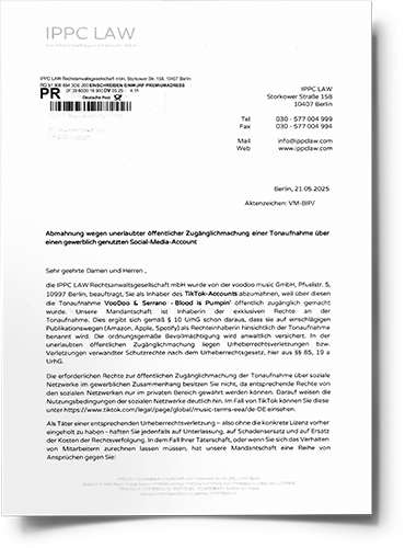 Die Kanzlei IPPC Law mahnt regelmäßig Social-Media-Nutzer und Unternehmen ab, die angeblich urheberrechtlich geschützte Musik ohne Lizenz verwendet haben – etwa in einem TikTok- oder Instagram-Video. In der Abmahnung wird meist eine Unterlassungserklärung verlangt sowie Schadensersatz und Anwaltskosten gefordert. Eine solche Abmahnung ist ein rechtliches Warnschreiben, das ernst genommen werden sollte, auch wenn der Anspruch zweifelhaft sein kann.